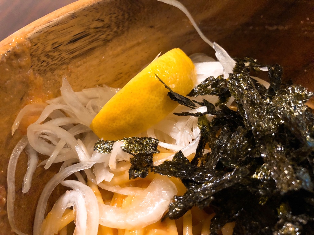そんな濃い味一辺倒を、最後まで楽しむための、味変レモン。意外なトッピングがベストマッチですよ。