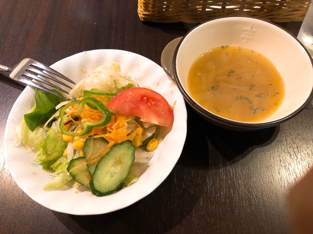 オニオンスープは野菜の旨味が濃厚でおいしく、サラダは至って普通の見た目ですが、たっぷりかかって下まで染みたドレッシングが超うまい。