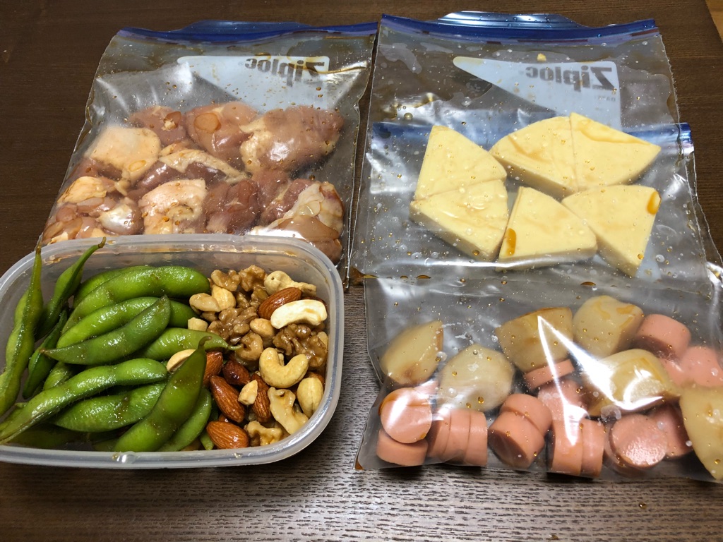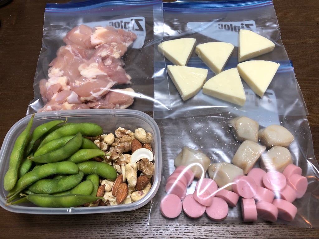 ギョニソ、ホタテ風かまぼこ、玉子、鶏肉、ミックスナッツ、枝豆、チーズ。