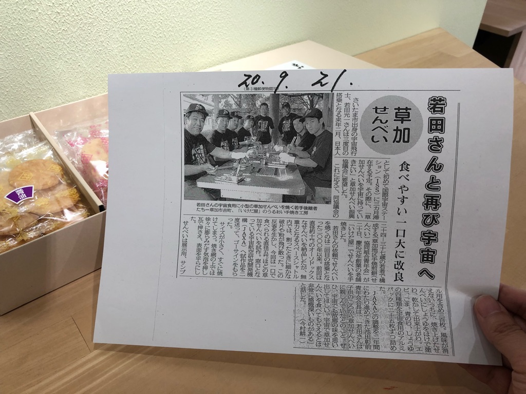 いけだ屋にはせんべい手焼き体験工房があり、そちらで青年会の方々が若田さん用のせんべいを手焼きし納品した(その現場に新聞・テレビ等の取材が入った)ということらしいんですよ。