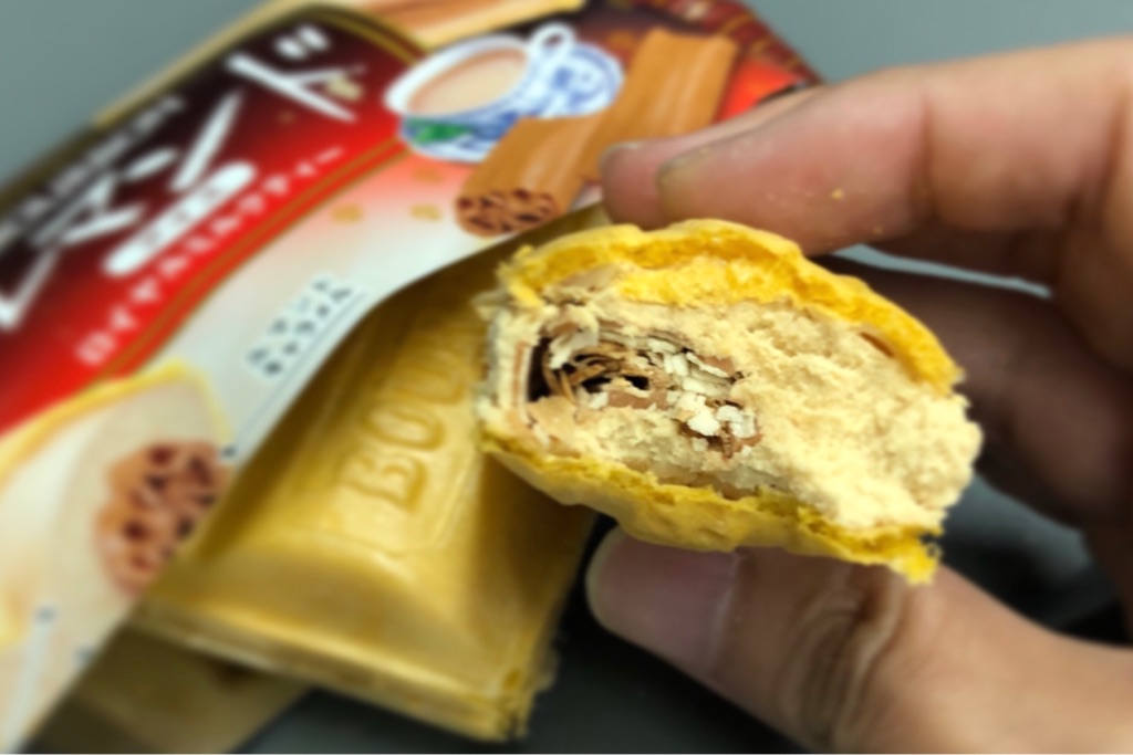 モナカの中には、ミルクティーアイス。そしてやや中心からズレていますが、芯として通っているのは……「ルマンド キャラメル味」!
