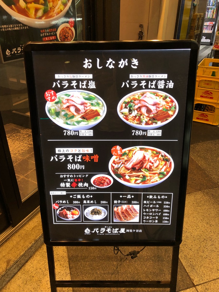 ……ん? 味噌ラーメンがある。そして、せあぶらそばがない。ははーん、これは支店がいくつかある中、阿佐ヶ谷店の独自のメニュー展開か……と思ったんですが、最初に言っておくと、後で確認すると「バラそば味噌」は季節限定。「せあぶらそば」は現在提供されていないみたい。……えー。せあぶらそばが一番好きだったのになあ。