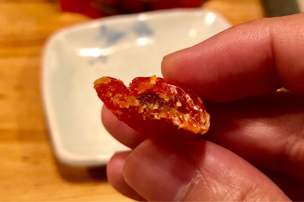 噛むとムッチリとした食感に、塩と砂糖の甘じょっぱさが、トマトの酸味と三位一体。お菓子というよりはおつまみに。チーズ等と合わせてオン・ザ・ルヴァンすると、ワインにも合いそうです。