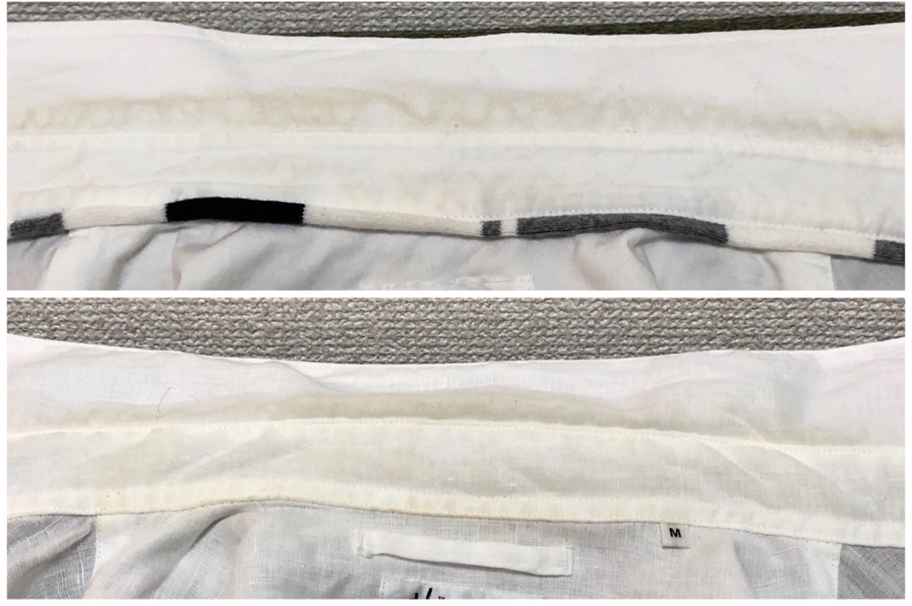 例えば、こんな感じです。上のシャツの汚れは、汗と皮脂による黒ずみ。