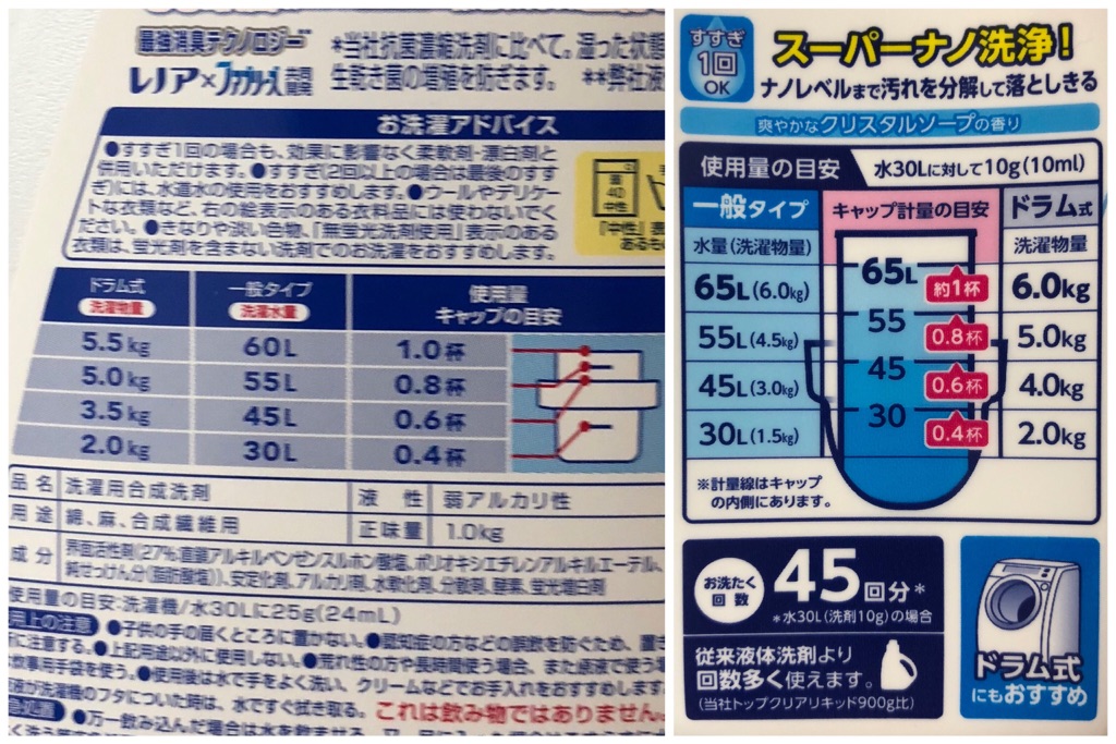 確かにアリエールは「水30Lに25g」、スーパーNAOXは「水30L(洗剤10g)」と、標準使用量は半分以下になってます。