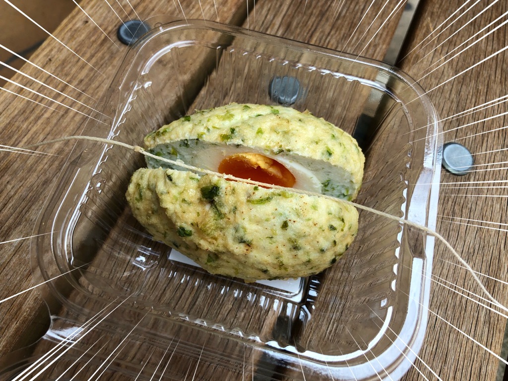 ただ、和風スコッチエッグという勝手な思い込みや、揚げたて揚げかまが他で売られていることから、アッツアツのばくだんかと思ったんですが、意外や冷蔵。