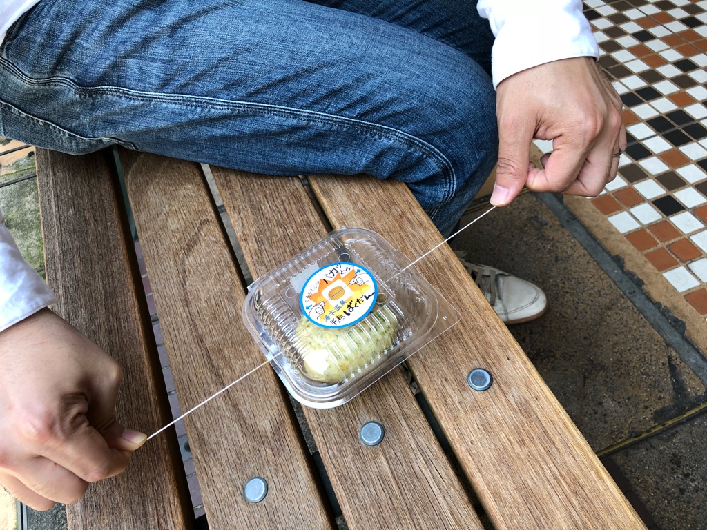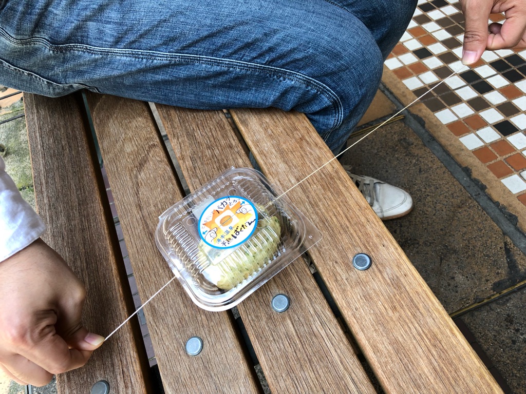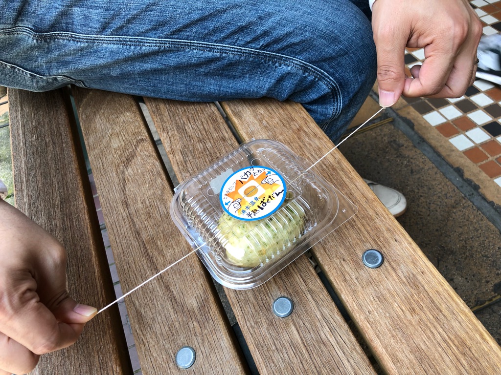 もちろん玉子1個入りなんで、かなりボリュームもあります。ヒモでパカッと割って2つにして、友人と分け合って、ほかの食べ歩きアイテムにも手を出すのが吉、かもしれません。