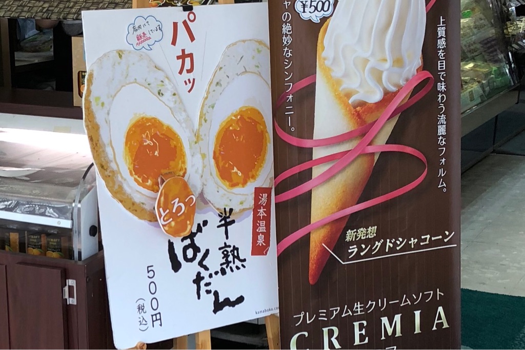 後で調べてみると、これは小田原の老舗蒲鉾メーカー・鈴廣の商品で、実は箱根に限らず熱海など神奈川の一部地域で「新名物」として販売されていたのですが、そんなことはどうでもいい。半熟玉子、パカッと割りたい。