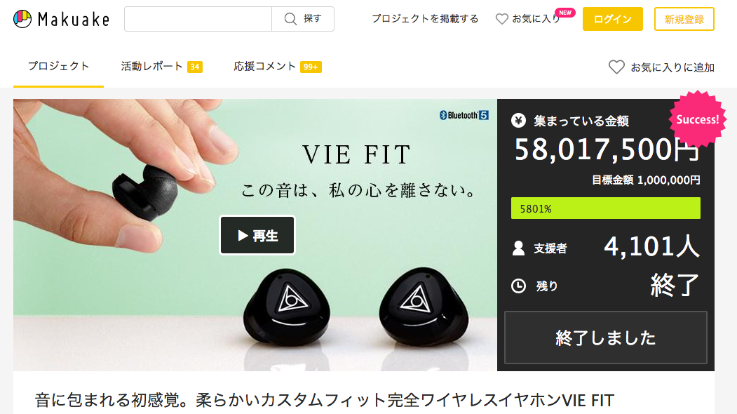 クラウドファンディングサービスMAKUAKEで支援を募り、目標金額の58倍でサクセスした「VIE FIT」は、やわらかいシリコン製のイヤーピースが、どんな耳にもフィットする完全ワイヤレスイヤホン。