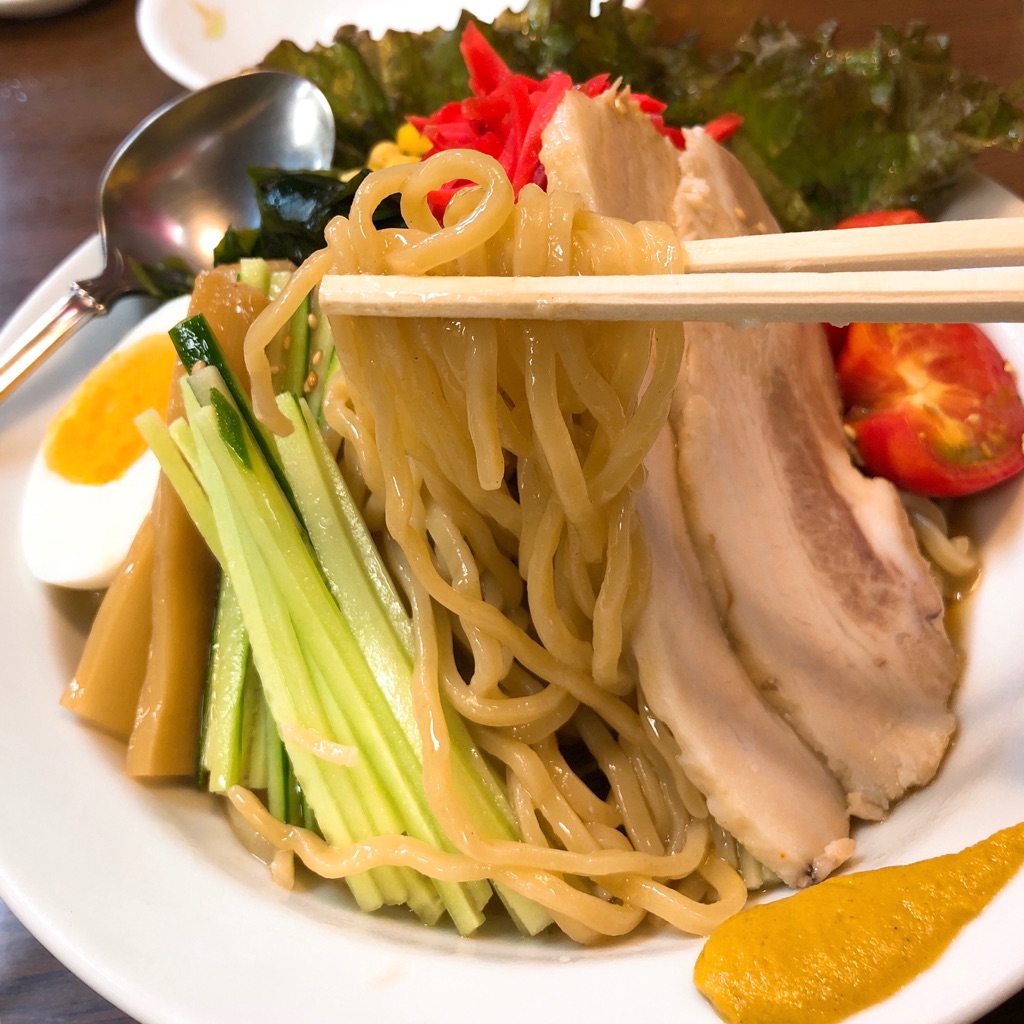 キーワードは「食べがい」。スープオフな分、冷やし中華はボリューム不足を感じることが多いんですが、見てのとおりのうず高い具の量。その具に負けないツルシコ極太麺。