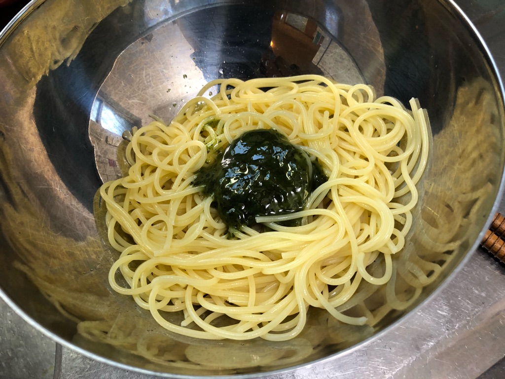 ちなみに、レシピには「(茹でた)パスタと混ぜ合わせ」るだけと書いてありましたが、暑いですよね〜。私は今回、茹でたパスタを水にさらして冷たく〆て、冷製パクベーゼとしてみました。