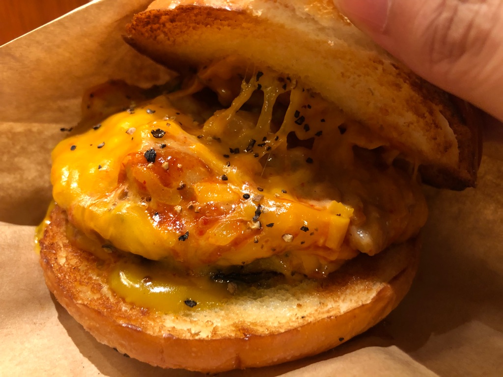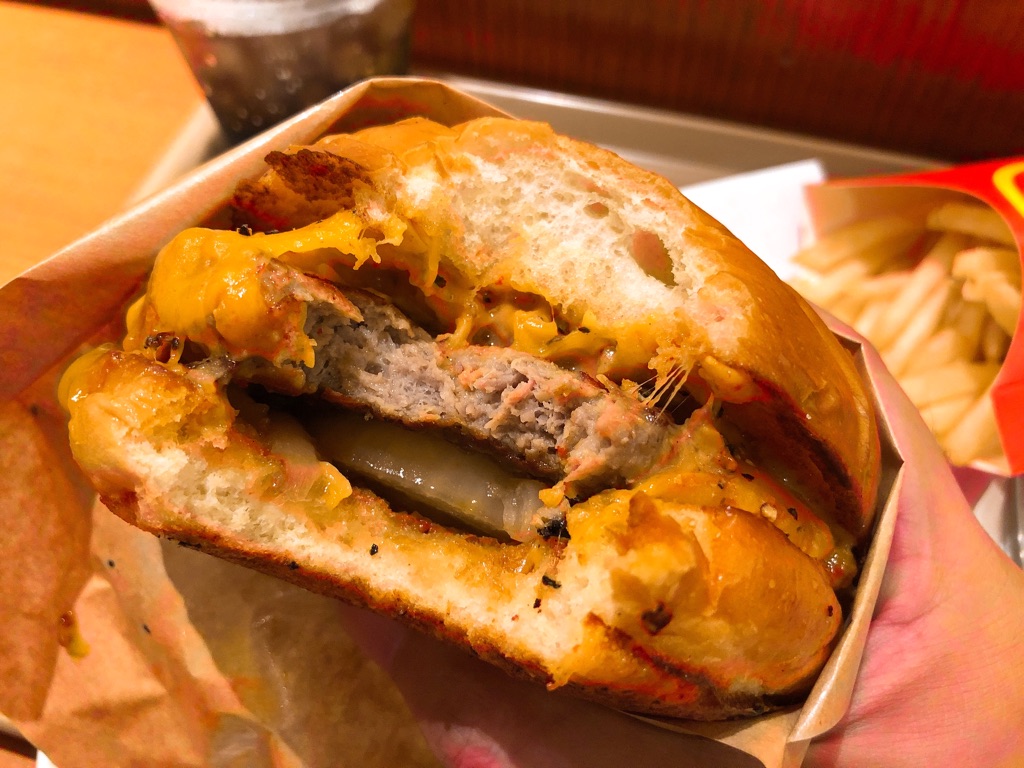 ミートパティの厚みも別格。さらにパティとたっぷりチェダーチーズの間には、色合い的に見えませんが、粗くマッシュされたポテトも入っています。