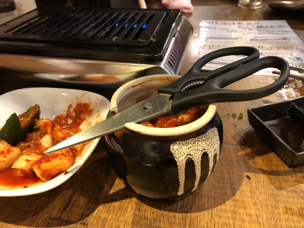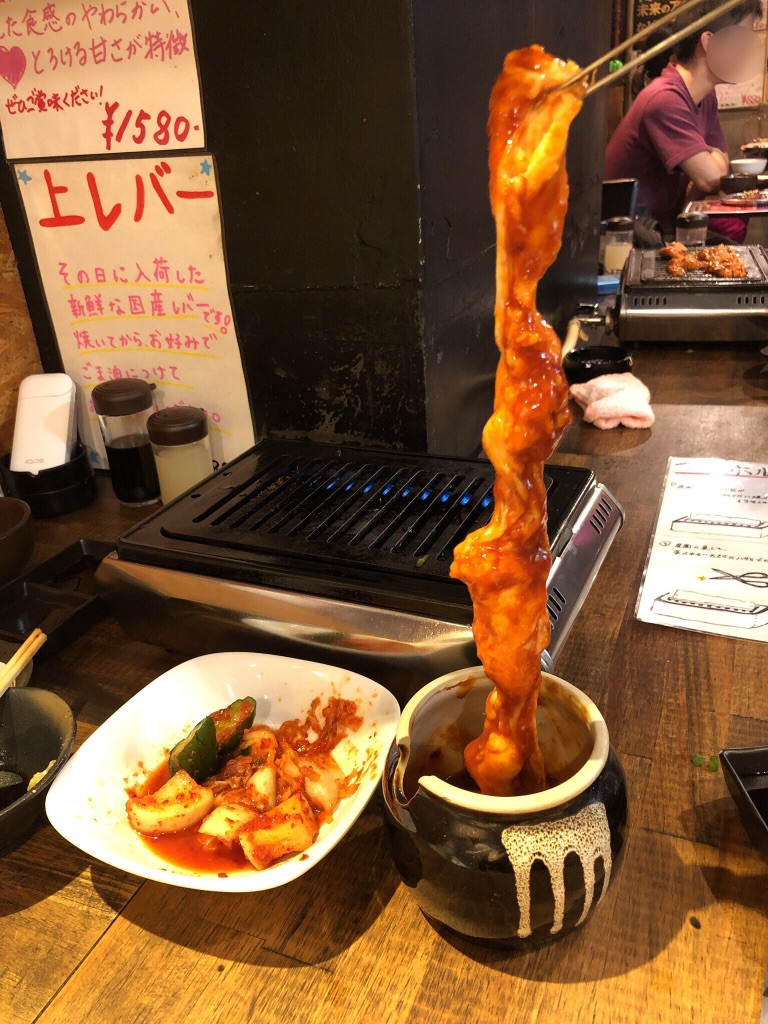 壺漬けカルビはよく見ますが、さすがにホルモンは初めてだと思います。いつもならカットされて出てきますけど、熟成壷ホルモンは、びろ〜んと一本漬け。秘伝の味噌ダレに充分漬かり、ホルモン好きなら「すげー!」と喜ぶところですが……