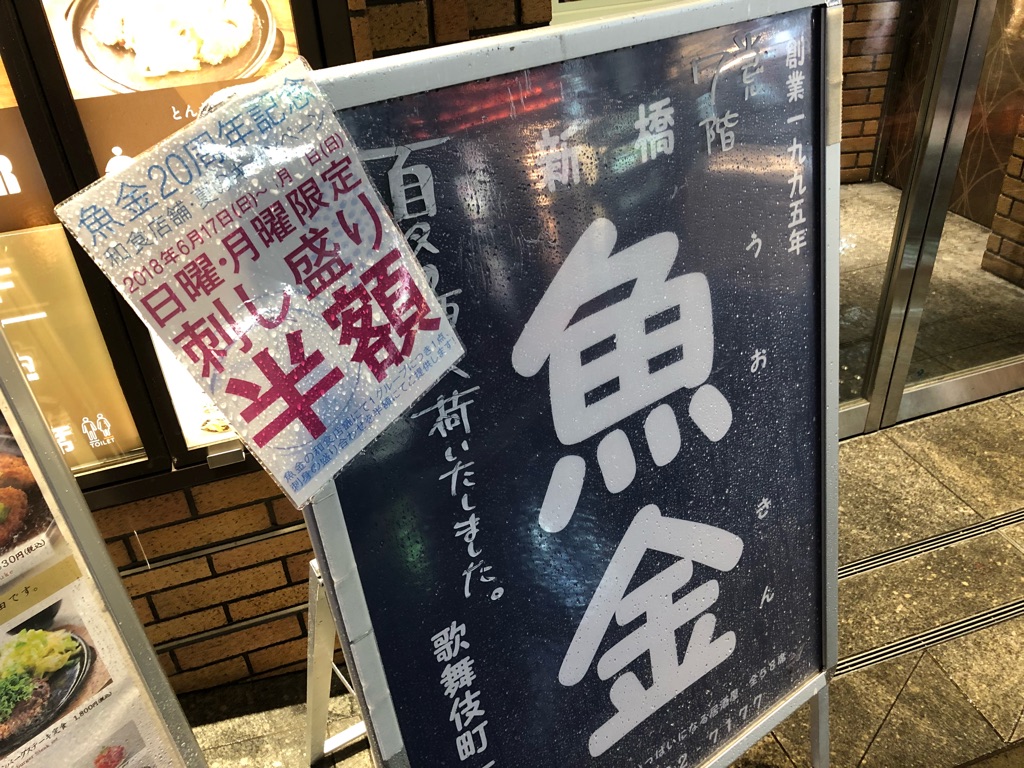 これは「魚金」各店で実施中の、20周年記念半額セール。