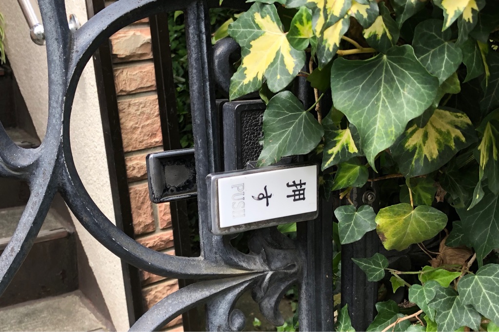 まあそこで終わるとオイオイ、お前こういう可能性あるぞ? というツッコミが来そうなんで続けると、この取手は反時計回りに回すんですよ。そうすると「押す PUSH」が正しい天地の方向になり、そこから門扉を「押す」。そうしてこのお宅には入るんです。この門扉は押して開けるタイプの開戸ということですね。たぶん、ですけどね。