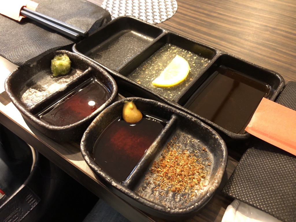 ▲用意されたタレ/左上から時計回りにレモンマスタード、焼肉のタレ、特製スパイス、マスタード醤油、わさび醤油