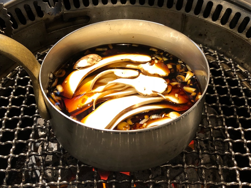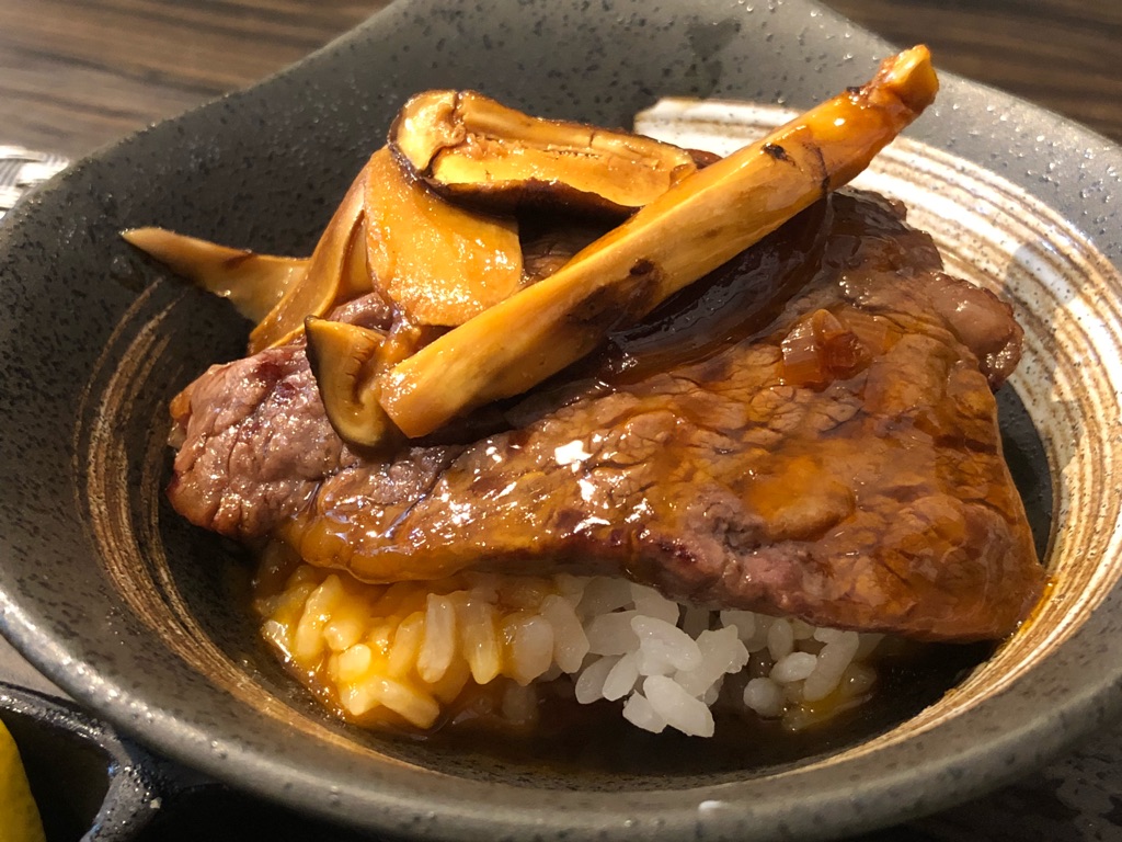 ひとくちご飯の上に、焼き上がったヒレを松茸入り割り下にくぐらせ、溶いた卵黄と絡めてのせる。さらに松茸を添えて完成する焼肉一品料理。ヤバい。