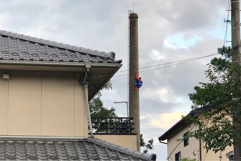 (さらにその奥の煙突に、スパイダーマンがいる。)