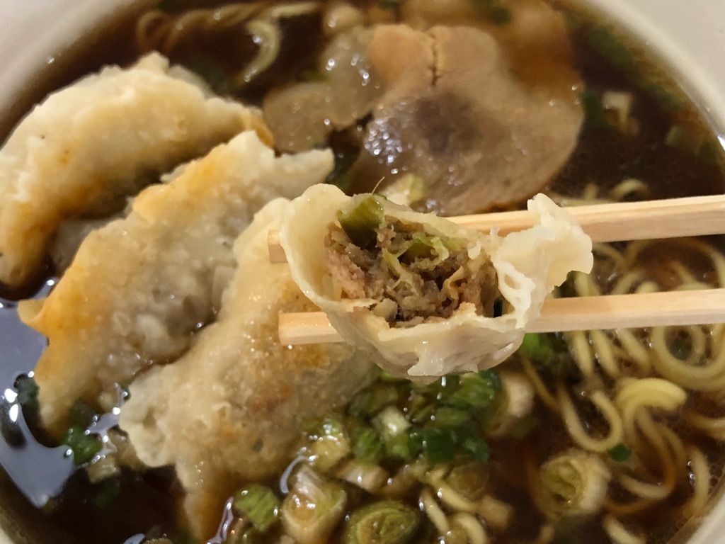 ラー油で味付けされているので、ワシミシと口の中で咀嚼していると、だんだん普通の“餃子”に戻っていく。