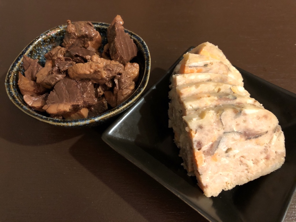 一品料理は「マグロの血合いの佃煮」(左)と「自家製魚肉ソーセージ」(右)をチョイス。