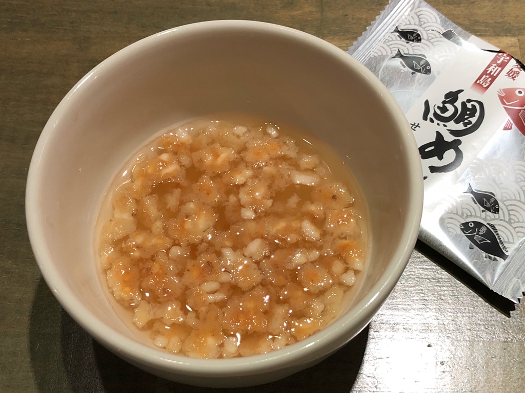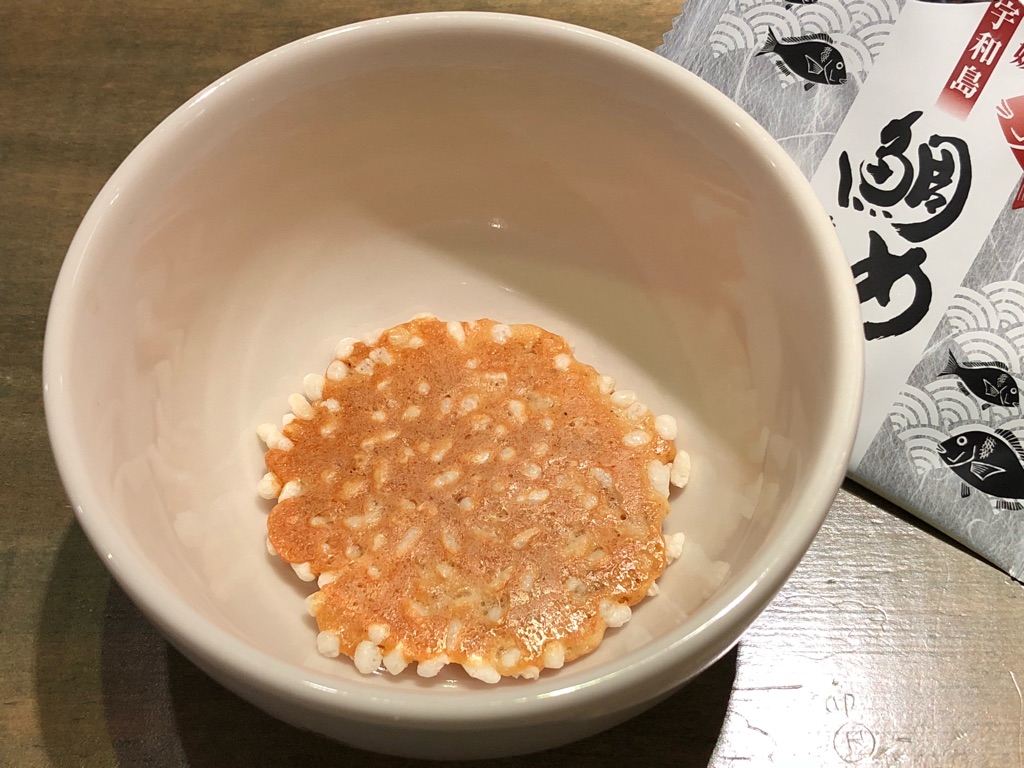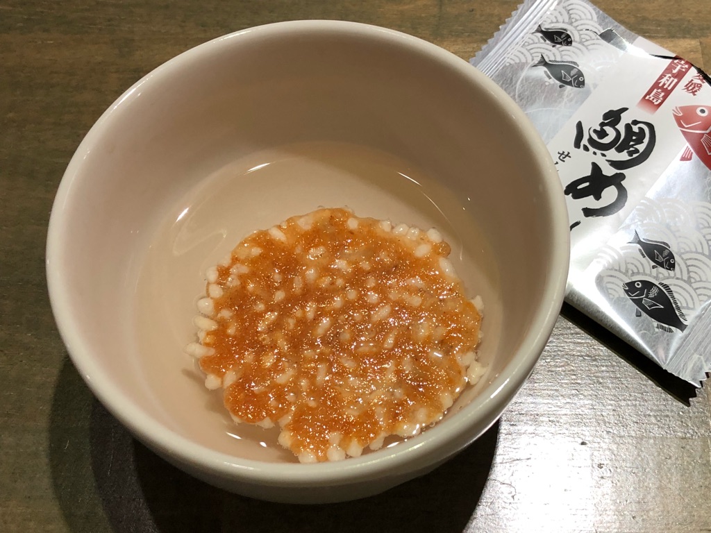 こうお湯で溶かした「宇和島鯛めしせんべい」に、万能ねぎでもパラリとかければ、二日酔いの朝の一食に……は、ならないかな?w