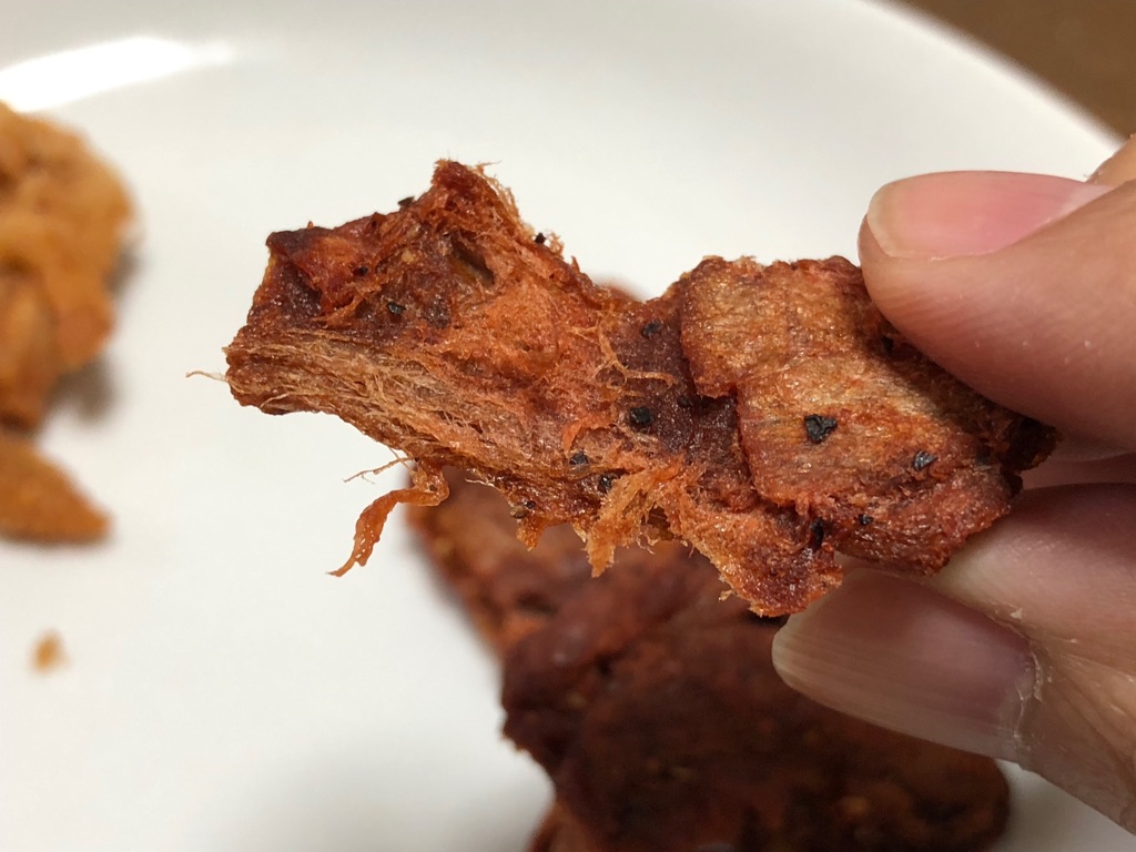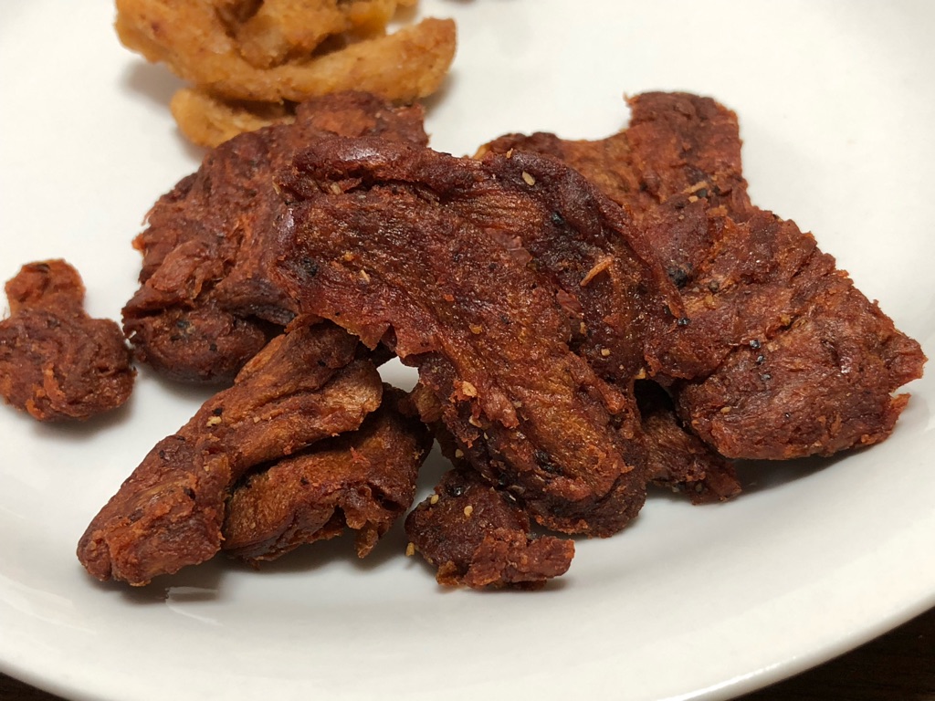 この食感の再現性に加え、黒胡椒をアクセントにした香辛料の風味と、しみでる旨み。こちらもビーフジャーキーだと言って出されたら、何も疑問を抱かずに普通に食べてしまいそう。