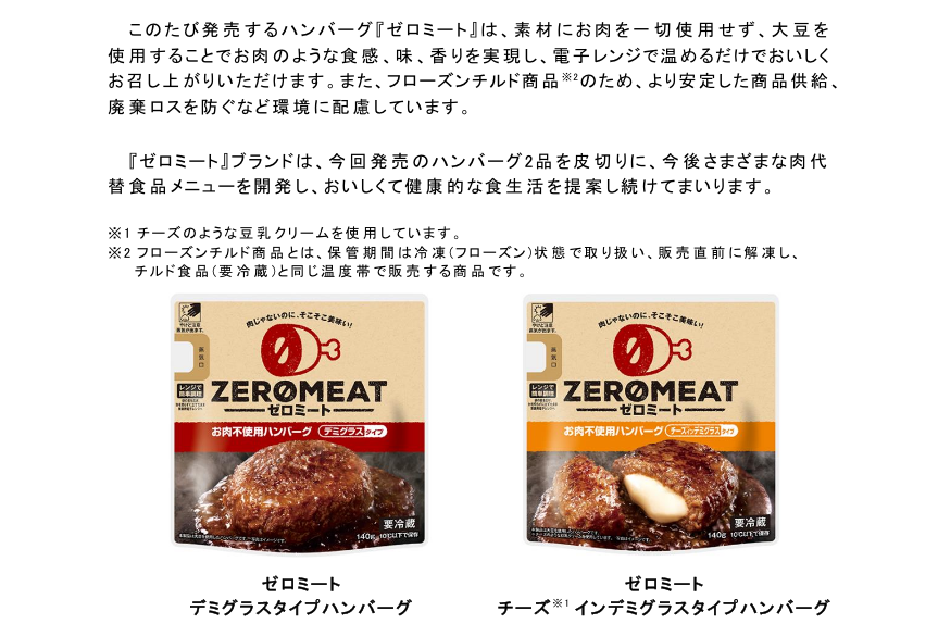 「ゼロミート」は、レンジアップですぐ食べられる、大豆製のハンバーグ。「肉じゃないのに、そこそこ美味い!」というキャッチコピーで、ヘルシーな植物性と、肉に肉薄する味わいを謳っていますが、発売日は11月27日。(関東エリアで先行発売開始。)