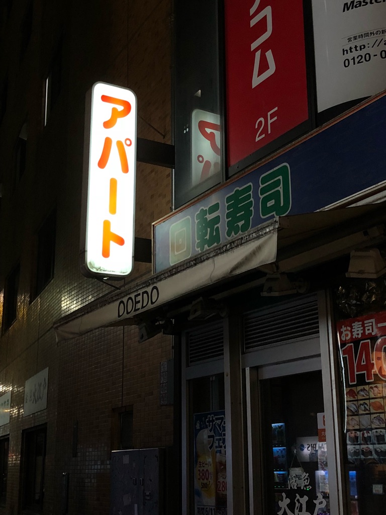 「アパート」。こっちこそきっと不動産屋の看板で、アパートを扱っていますよという自己主張だと思うんですが、あまりに抽象的で「山田マンサード」との対比もあってちょっとおもしろくなってしまいました。
