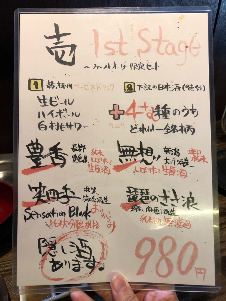 日本酒を飲む気まんまんであれば、ファーストオーダー限定のセットがオススメ。4種の日本酒をあとにして、まずの乾杯ドリンク(生ビール・ハイボール・白桃サワーいずれか)が無料になる、980円。
