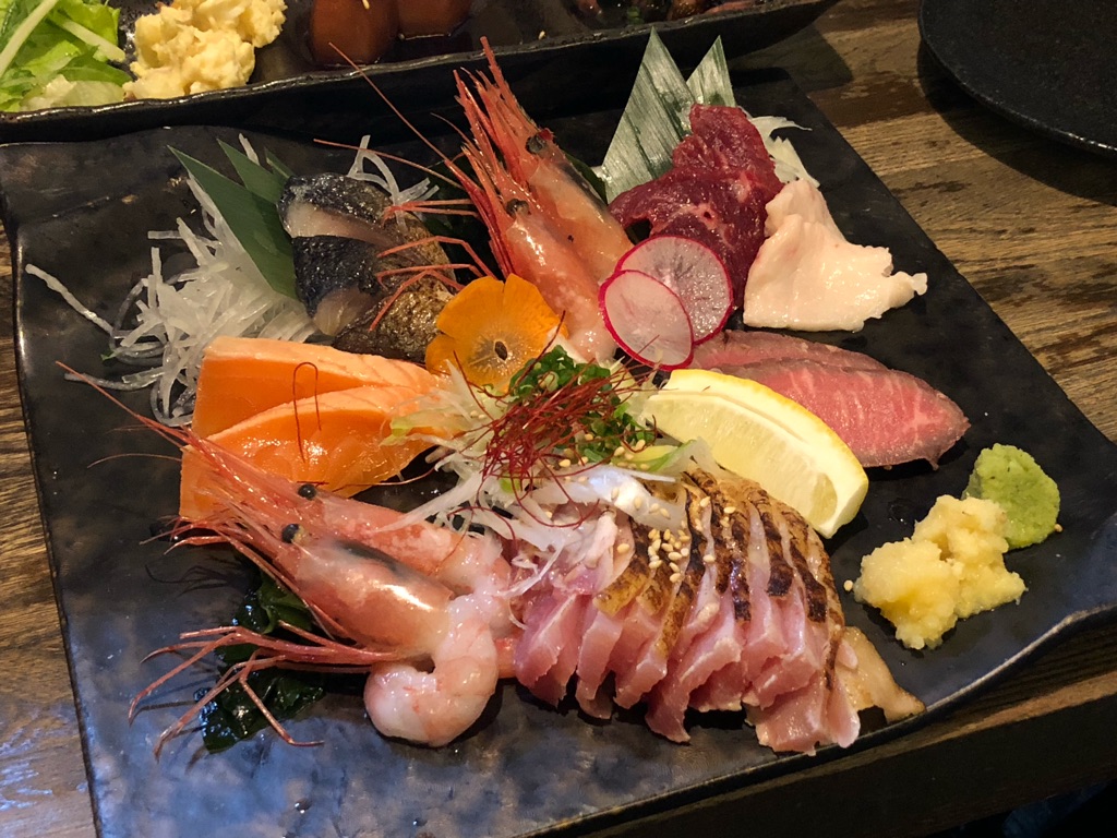甘エビ、〆鯖、サーモンの魚刺しと、肉刺しは馬刺し(たてがみ添え)、ラム、鳥たたき。
