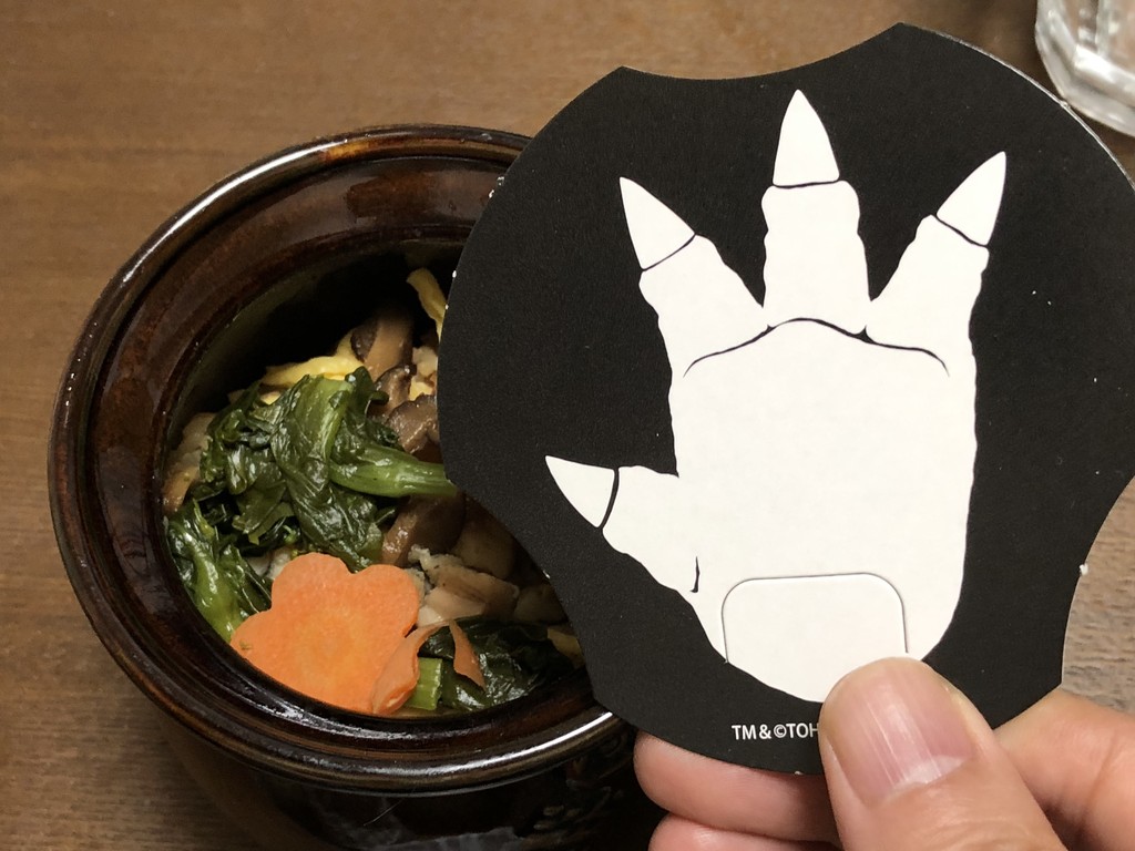 具材だけでなく、器も通常のひっぱりだこ飯と異なった特別仕様。「表現が難しく、かわいすぎでもダメだし、違う怪獣になっても困るので、何度も描き直し、彫り直してようやく完成した。陶器ならではの、釉薬の付け具合で一つ一つ色加減が微妙に異なるところも魅力」と担当者。