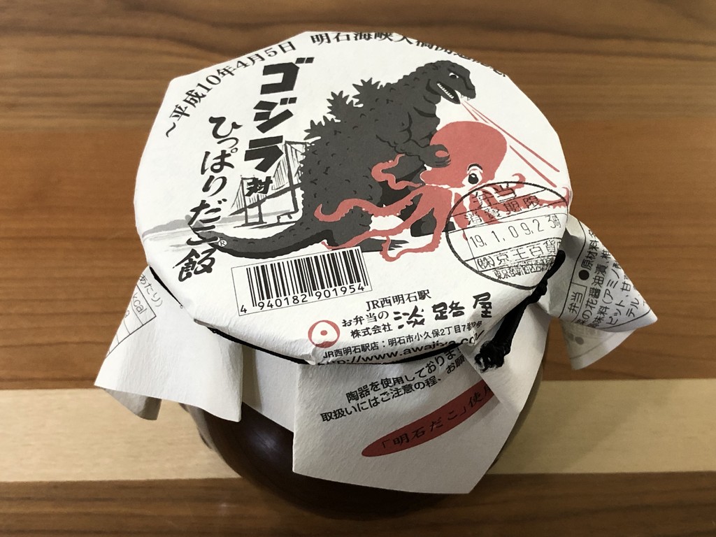 もうひとつ買った駅弁は、兵庫・明石の淡路屋「ゴジラ対ひっぱりだこ飯」。これは駅弁大会限定というわけではなく、イベントに先駆け5日から、西明石駅・神戸駅などで発売している期間限定アイテムということみたいです。