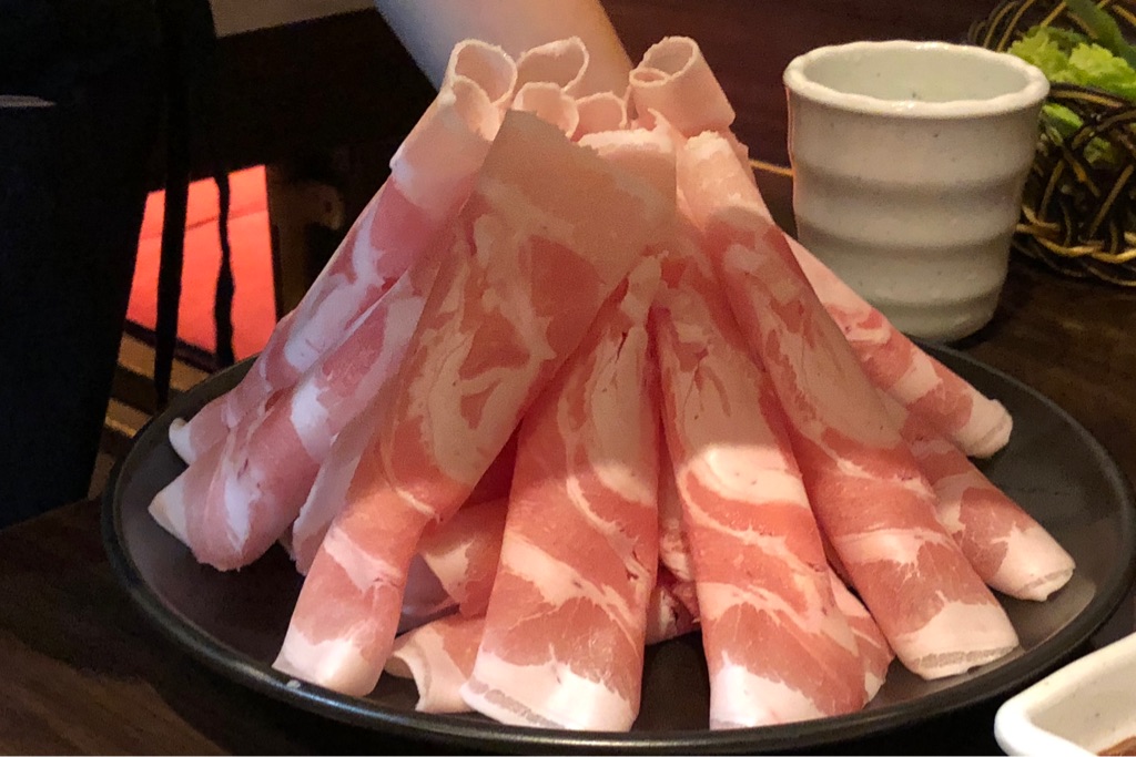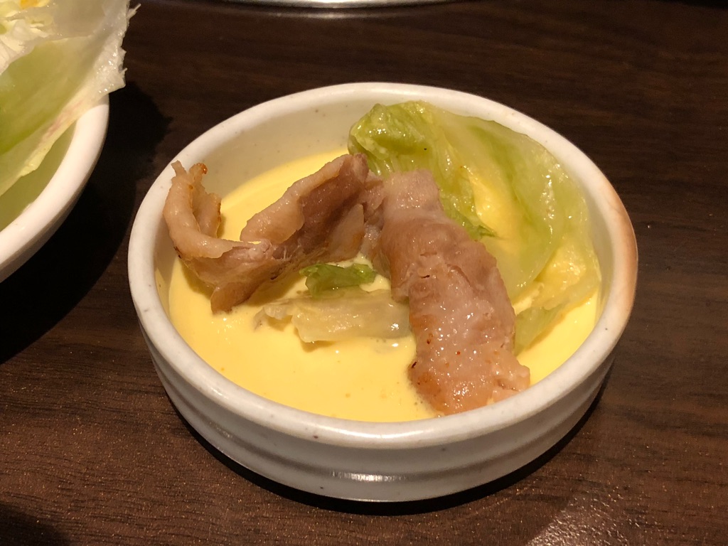 薄切りの豚バラは、火が通り過ぎないようにレタスの上に積まれ、あとはご自分でどうぞとばかりに店員さんは去って行く。