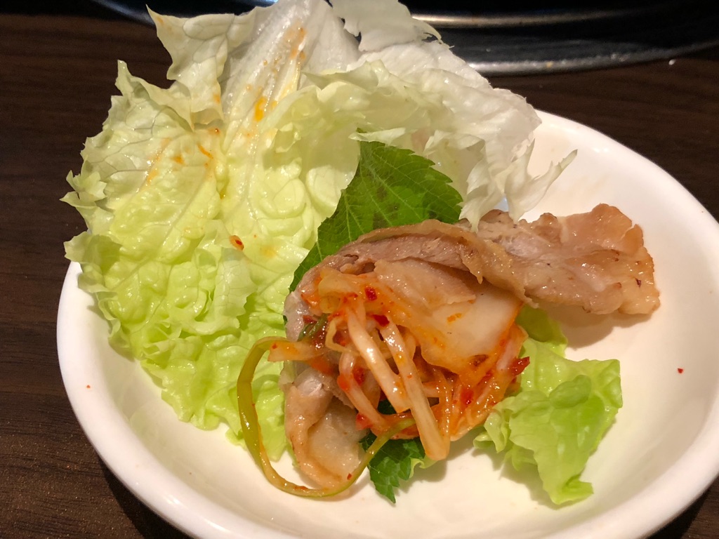 ただ生の肉を持って来て勝手にやってくれというスタイルだったら、私は普通に一枚ずつ焼いて、タレにつけておしまい。キムチはそのまま付け合せとして食べてたし、いろいろ試す楽しさは皆無だったでしょう。