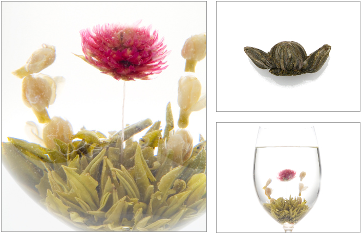 「お茶をお召し上がりいただいた後の茶葉は、お水に移し替えて水中花としてお楽しみください。」