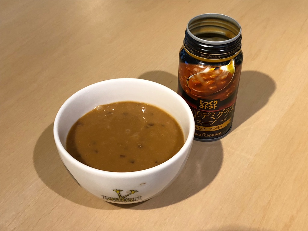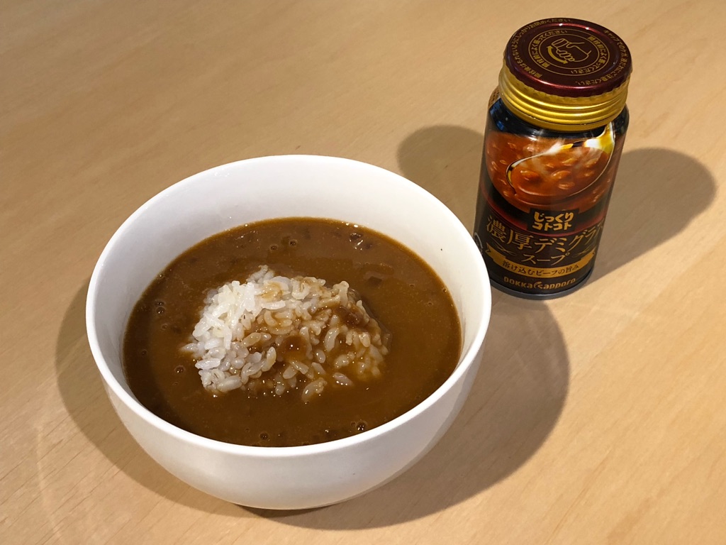 朝ごはんを家で摂らずに仕事に出かけた日、今日はコレだ! と思いついて、「濃厚デミグラススープ」を駅の自販機で買い、仕事場への道すがら、ライスも購入。