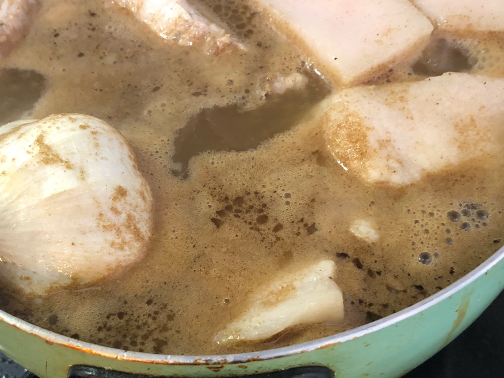 と、以前お届けした「肉骨茶の素」レポート。この調理中、やたらと煮汁にアクが出て困ったんですよ。
