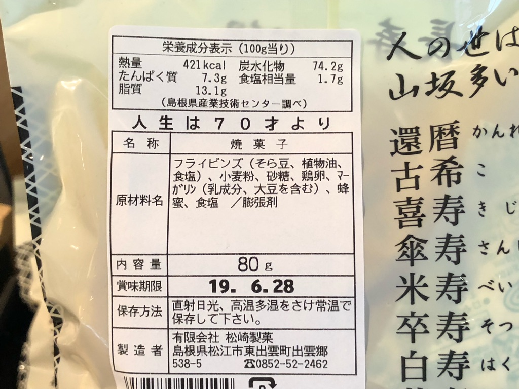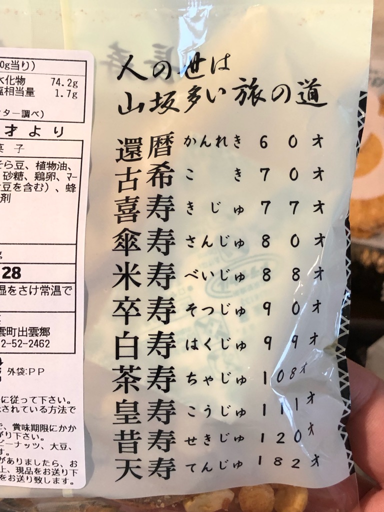 「人生は七十才より」と格言が書かれたこれ、お菓子なんですよ。おかしいですよね。……え?
