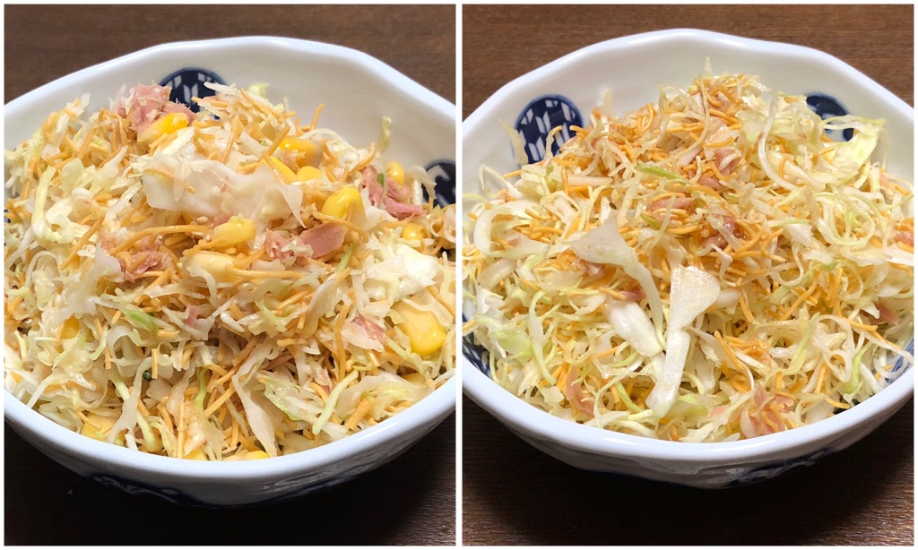 右(→)が「皿うどん」を使った無限キャベツ。