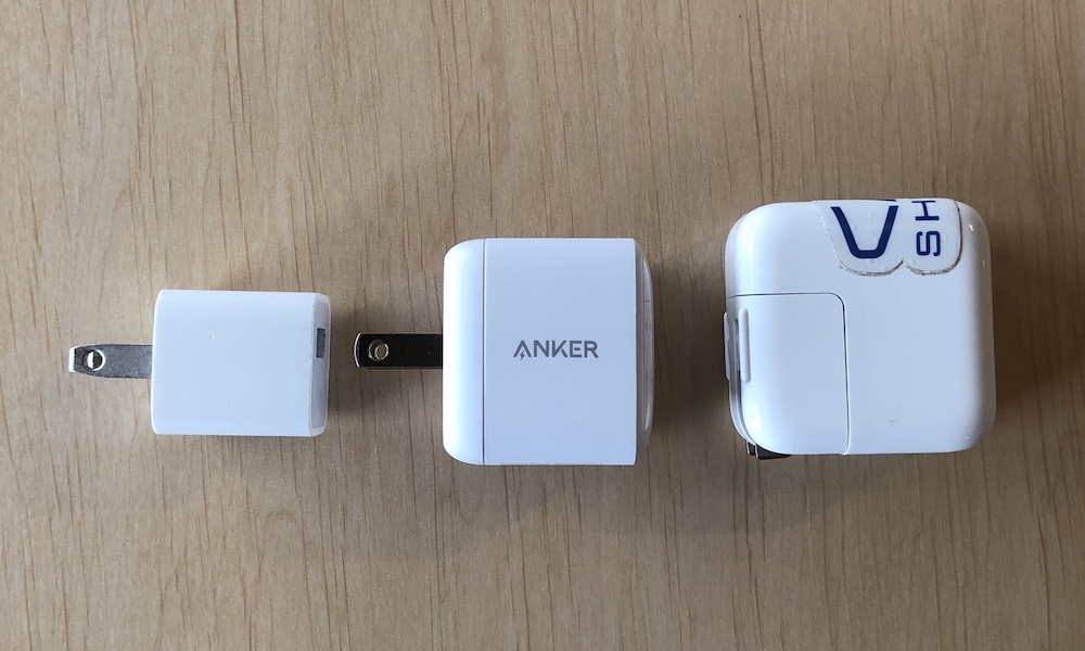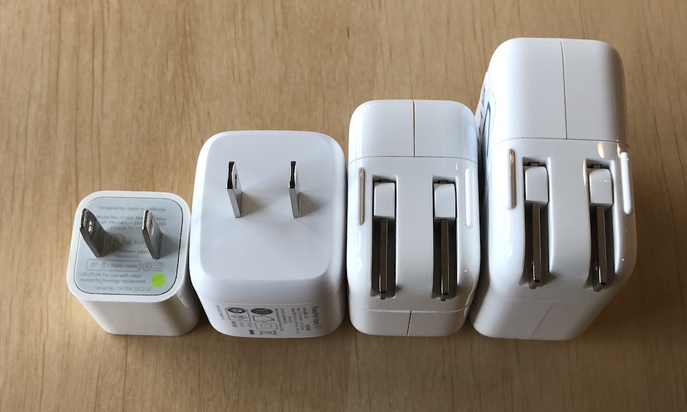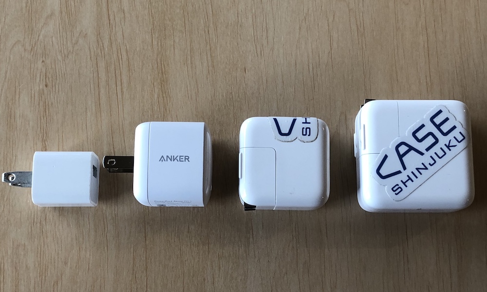左から、iPhone用ACアダプタ、PowerPort Atom PD 1、iPad用ACアダプタ、そしてMacBook Air(2018)に付属する専用ACアダプタです。