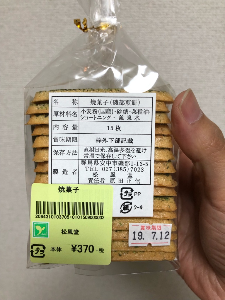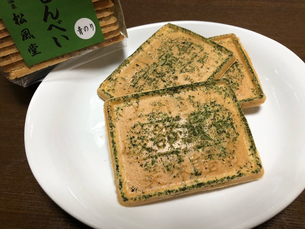 いわゆる鉱泉せんべいですが、珍しく四角い形。そして型に書かれているであろう「磯部煎餅」の文字すら見えないくらい、青のりがふんだんにふりかかっていて、地味な甘さとしょっぱさの妙味がなかなかおいしいです。