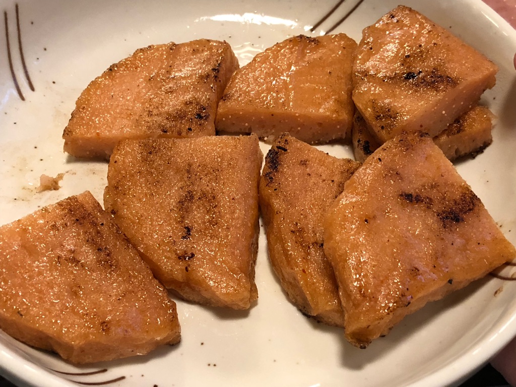 「めんたい天」は焼いてそのまま食べてみました。魚のすり身としてのボディに、イカの食感や明太子の味がアクセント。確かにこれおいしい。