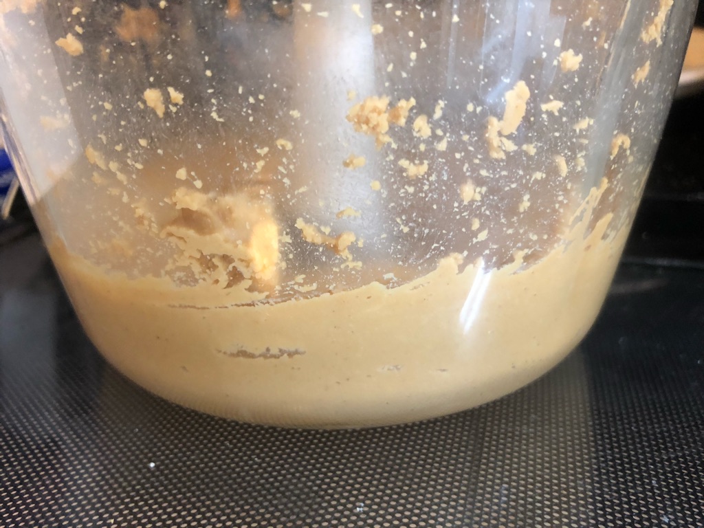そのうち団子状になり、それでも粒感はあるままでペタペタと回転刃にまとわりつき、おいこれ本当にバターになるのかよと心配になった時、