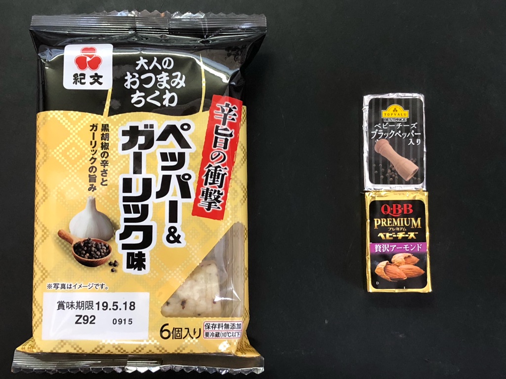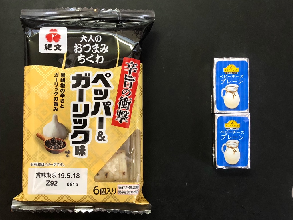 「大人のおつまみちくわ ペッパー&ガーリック味」+アーモンド入りチーズ。