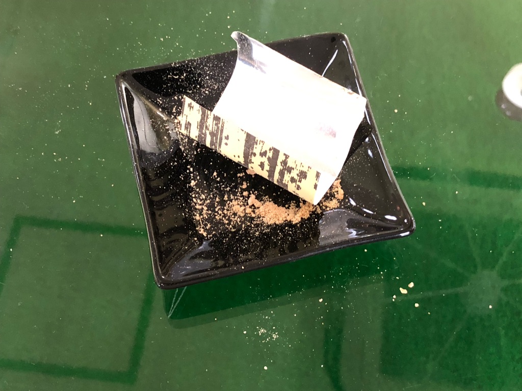 五島列島銘菓「ちゃんここ」。きなこをこぼしまくるお菓子。箱にすでにもれまくり。