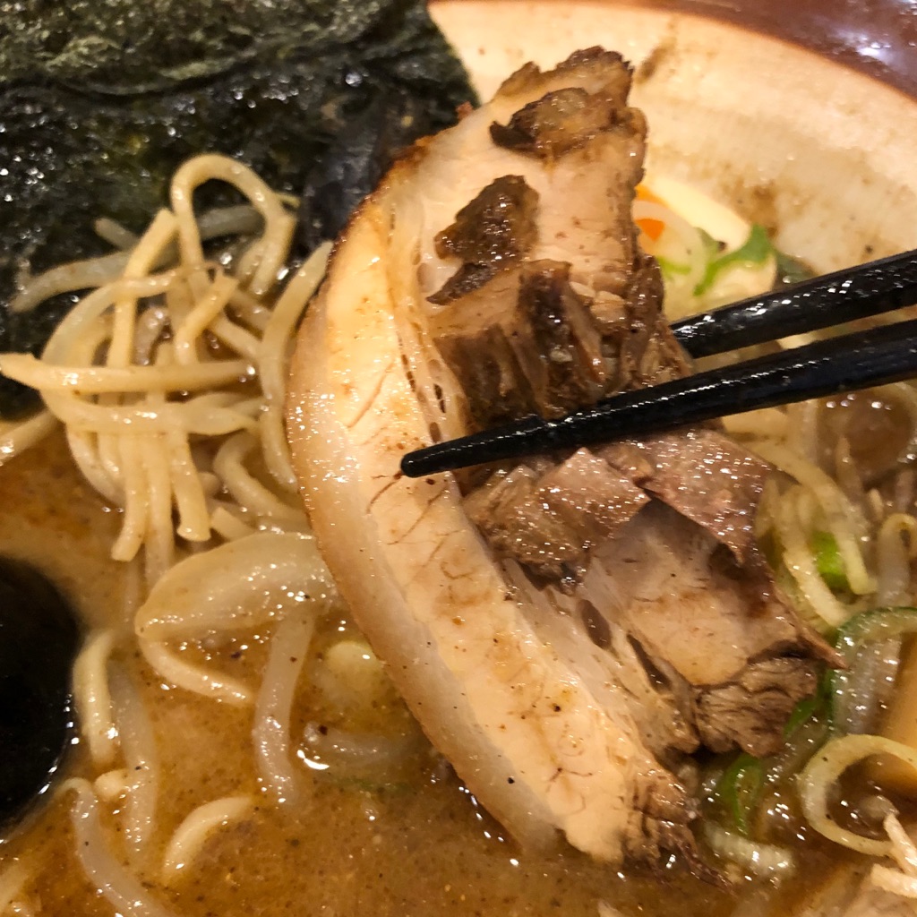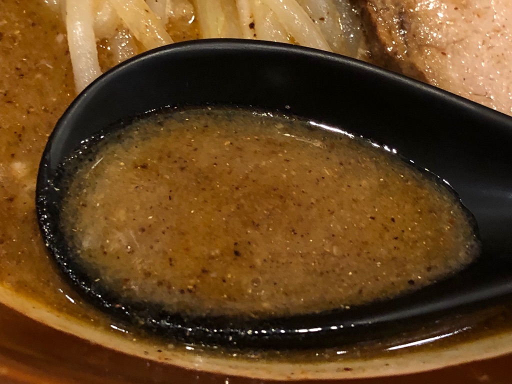 そうして出て来たのが、冒頭のこのラーメン。基本のトッピングはネギ、極太メンマ、きくらげ、チャーシュー、海苔。あと、麺とからんだもやし。