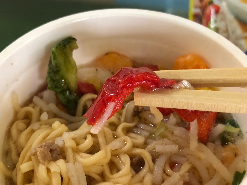 ピーマンとパプリカの色合いが、茶色いカップヌードルに彩りを与え、見た目のおいしさが倍増。