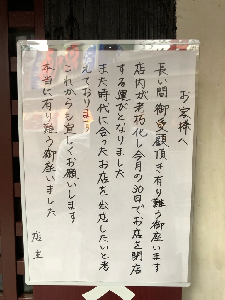告知には「また時代に合ったお店を出店したい」と書いてあるので、店内のリフォーム・リニューアルして新たな店に生まれ変わることを期待したいですね。