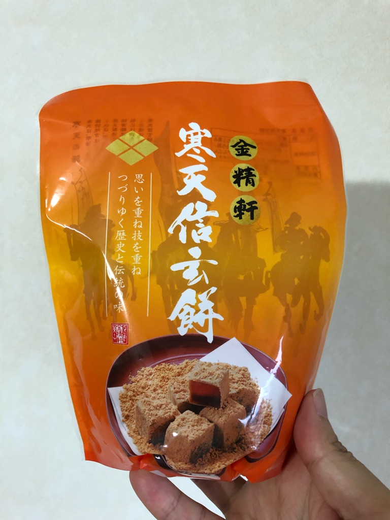 山梨土産の「金精軒寒天信玄餅」。