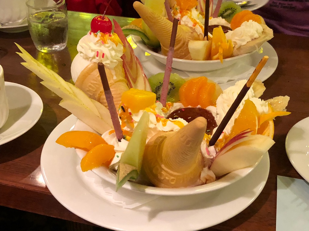 フルーツもりもり、生クリームたっぷり、アイスコーンとポッキーが演出する高さと広がり。